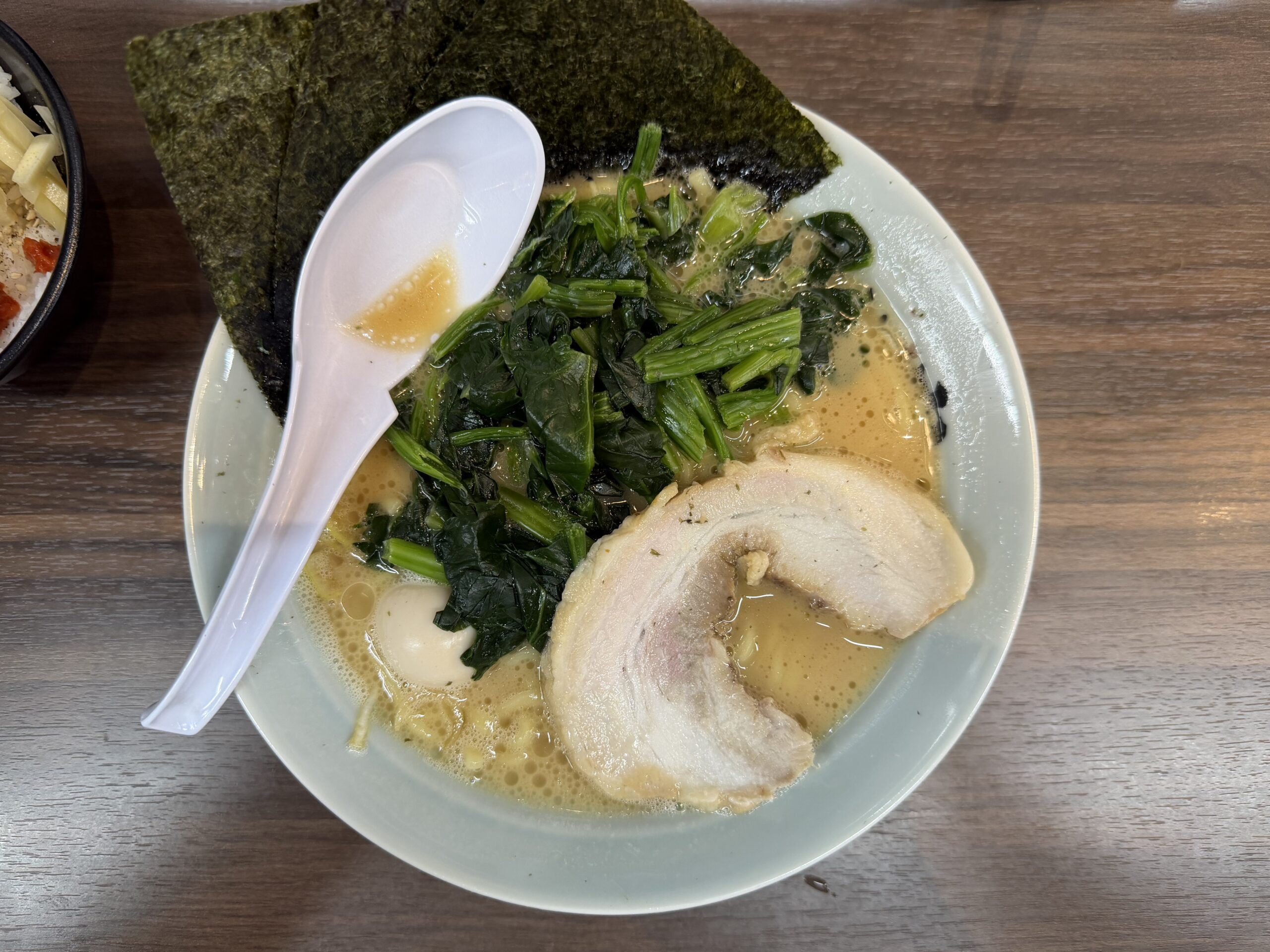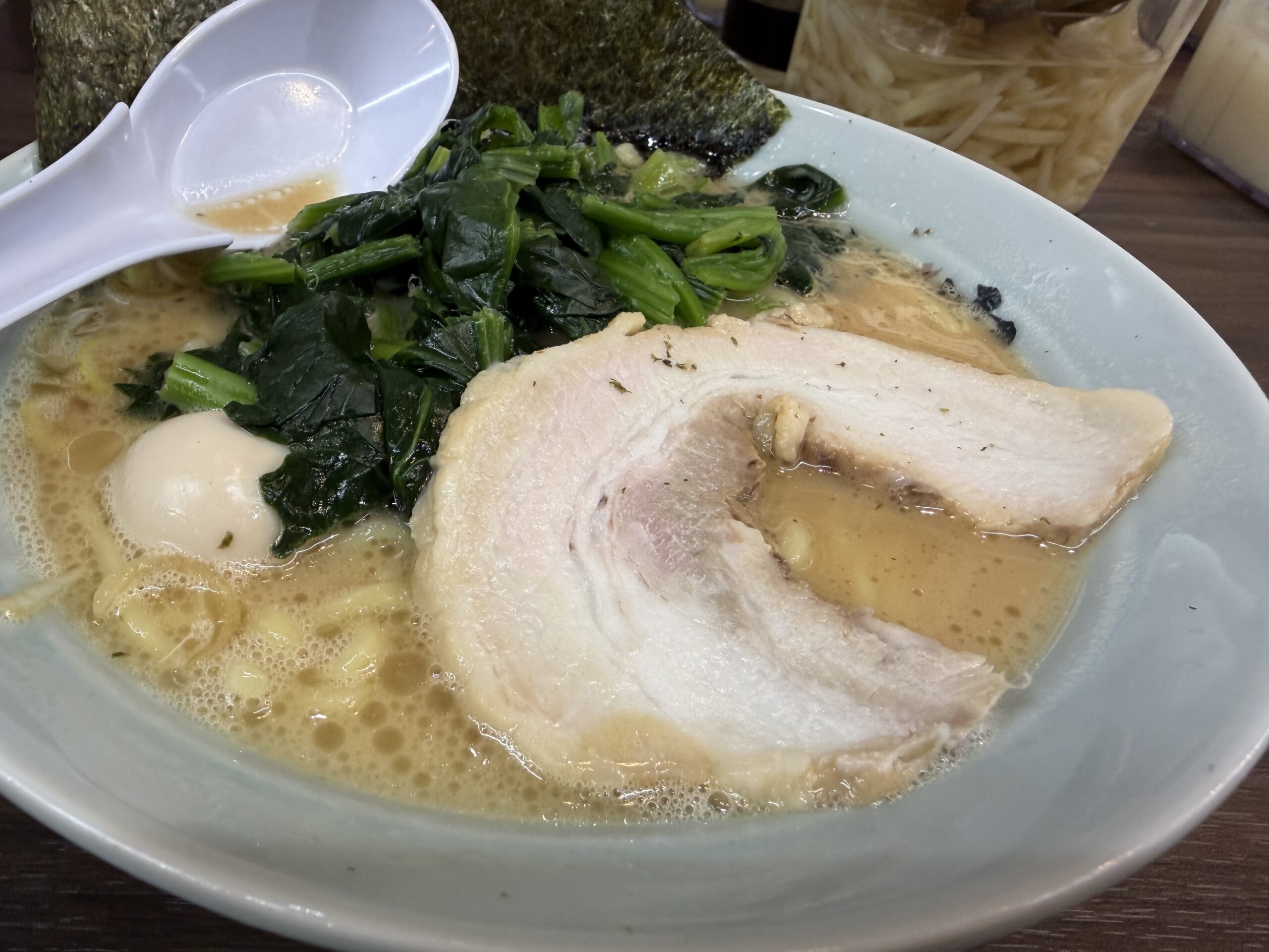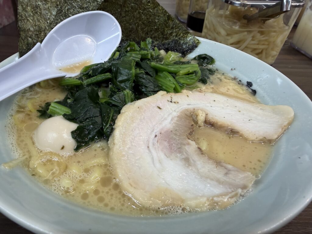 まくり券のほうれん草を入れて、味濃いめが“ちょうど良い”仕上がりに。家系はトッピングでバランスを作るのが楽しい一杯でした。